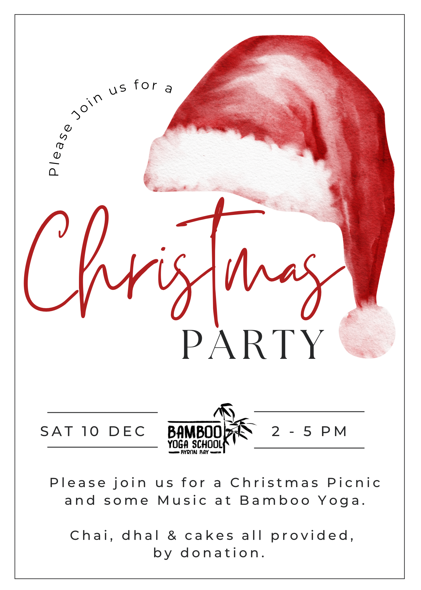 Please join us for our Bamboo Yoga Christmas Picnic - a casual afternoon underneath the fig tree, enjoy some dhal, cake and chai. Family and friends are all welcome. Drop in for a few minutes or stay for the afternoon.